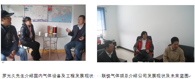 2013年12月26日(ri)上(shang)午(wu)協(xie)會(hui)拜(bai)訪(fang)了(le)中(zhong)山(shan)市(shi)華(hua)新(xin)氣(qi)體(ti)有(you)限(xian)公(gong)司(si)和(he)中(zhong)山(shan)市(shi)菱(ling)鳥(niao)氣(qi)體(ti)有(you)限(xian)公(gong)司(si)。中(zhong)山(shan)市(shi)華(hua)新(xin)氣(qi)體(ti)有(you)限(xian)公(gong)司(si)的(de)總(zong)經(jing)理(li)鄭(zheng)偉(wei)榮(rong)和(he)生(sheng)產(chan)副(fu)總(zong)經(jing)理(li)譚(tan)啟(qi)權(quan)、中山市菱鳥氣體有限公司總經理毛文軍接待了大家,廣東省工業氣體協會專家委員會主任委員兼副秘書長劉晟就協會2014年的工作思路和方向給大家做了詳細的介紹,大家對劉主任講解的內容表示讚同.就中山地區目前的氣體市場發展情況,大(da)家(jia)進(jin)行(xing)了(le)討(tao)論(lun),他(ta)們(men)希(xi)望(wang)協(xie)會(hui)在(zai)新(xin)的(de)一(yi)年(nian)裏(li)多(duo)和(he)會(hui)員(yuan)單(dan)位(wei)進(jin)行(xing)交(jiao)流(liu)和(he)溝(gou)通(tong),為(wei)其(qi)提(ti)供(gong)最(zui)新(xin)的(de)技(ji)術(shu)和(he)政(zheng)策(ce)方(fang)麵(mian)的(de)信(xin)息(xi),華(hua)新(xin)氣(qi)體(ti)有(you)限(xian)公(gong)司(si)還(hai)就(jiu)杜(du)瓦(wa)罐(guan)檢(jian)測(ce)站(zhan)的(de)建(jian)立(li)程(cheng)序(xu)及(ji)具(ju)備(bei)的(de)條(tiao)件(jian)進(jin)行(xing)了(le)谘(zi)詢(xun),專(zhuan)委(wei)會(hui)主(zhu)任(ren)委(wei)員(yuan)兼(jian)副(fu)秘(mi)書(shu)長(chang)劉(liu)晟(sheng)就(jiu)程(cheng)序(xu)、資源整合、設備更新、人員配備等方麵做了介紹,對目前政府方麵的政策也給予了指引。隨後大家一起參觀了這兩個公司的生產現場