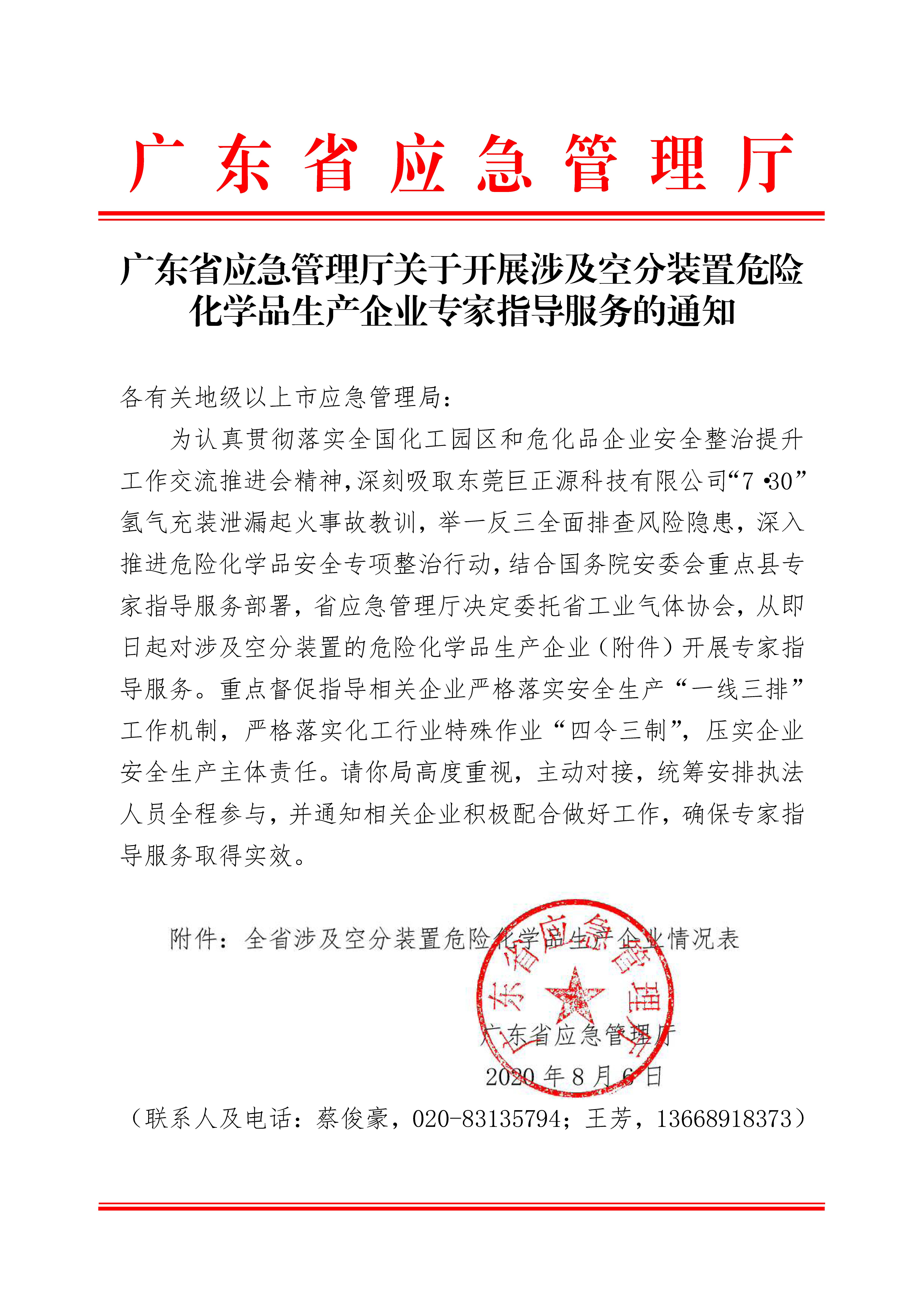 廣東省應急管理廳關於開展涉及空分裝置危險化學品生產企業專家指導服務的通知