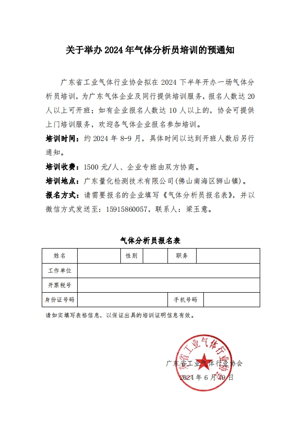 關於舉辦 2024 年氣體分析員培訓的預通知