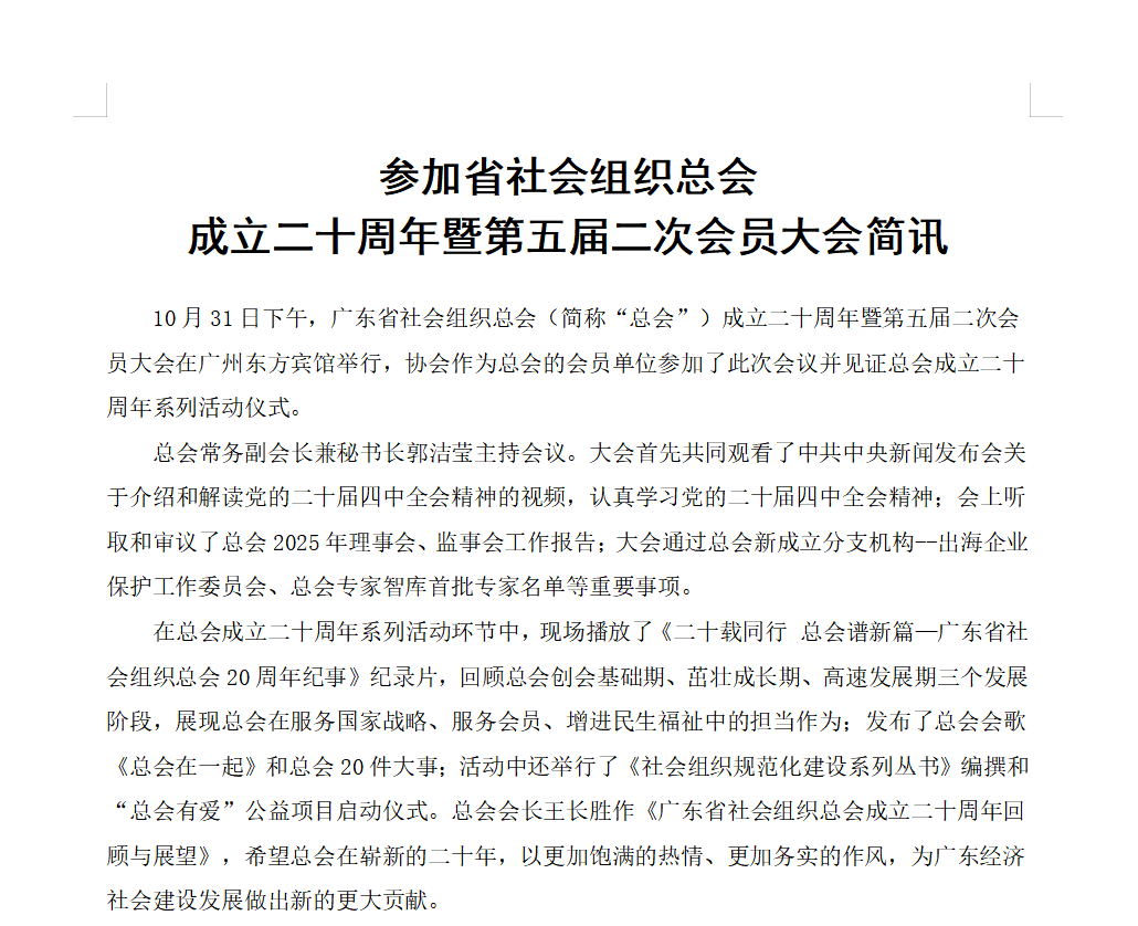 參加省社會組織總會成立二十周年暨第五屆二次會員大會簡訊