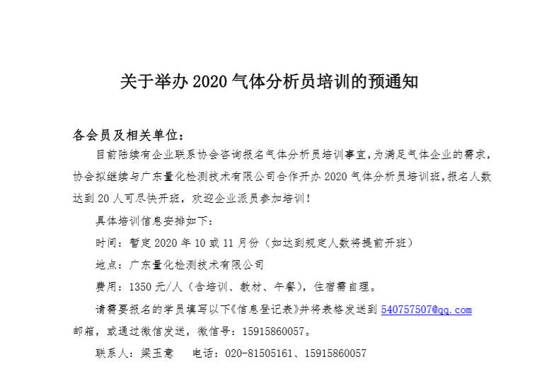 關於舉辦2020氣體分析員培訓的預通知