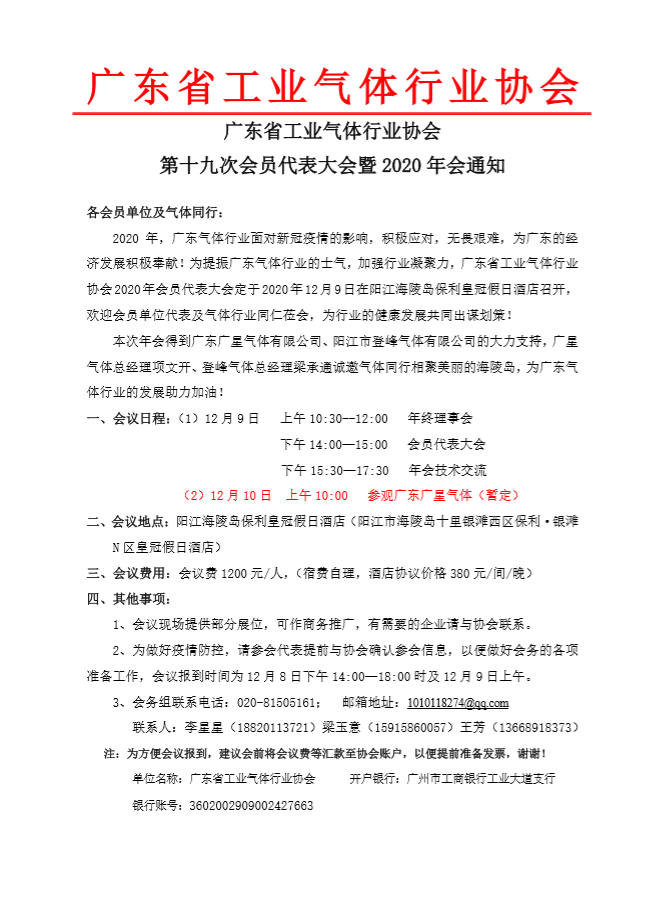 廣東省工業氣體行業協會第十九次會員代表大會暨2020年年會通知