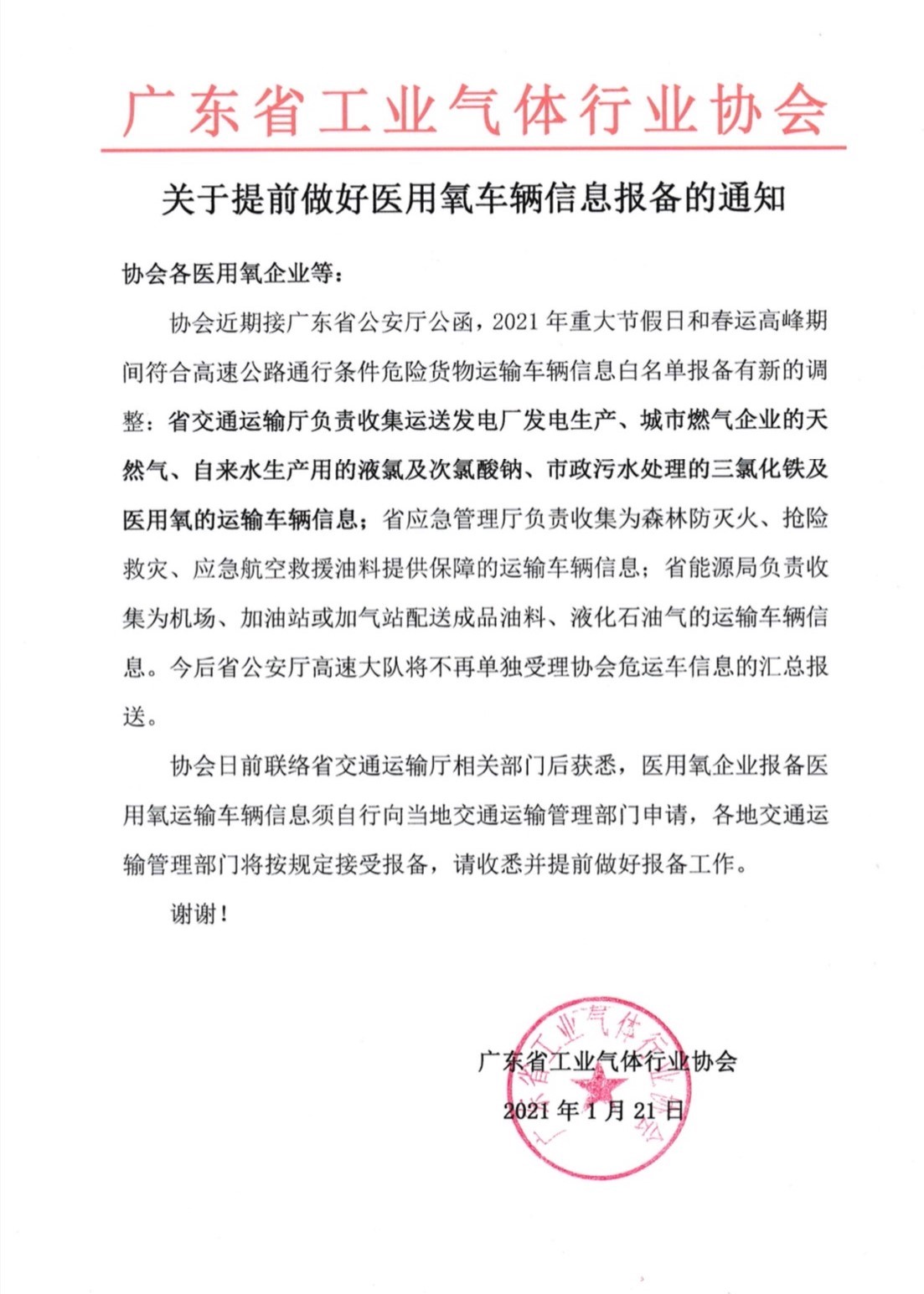 關於提前做好2021年春節期間醫用氧車輛報備的通知