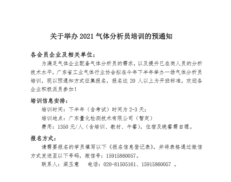 關於舉辦2021氣體分析員培訓的預通知(點擊下載)